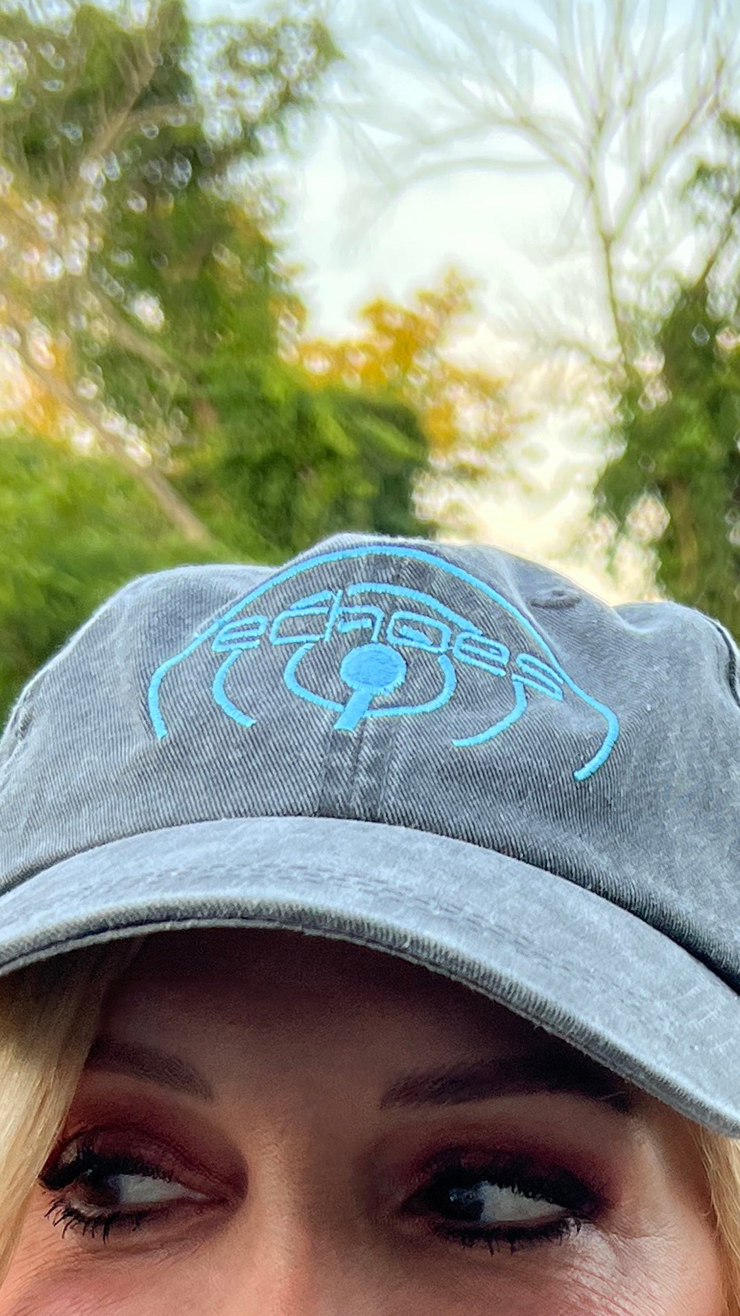 Get the new Echoes Hat (Baseball Cap). It's a weathered grey cap with the echoes logo embroidered in light blue.